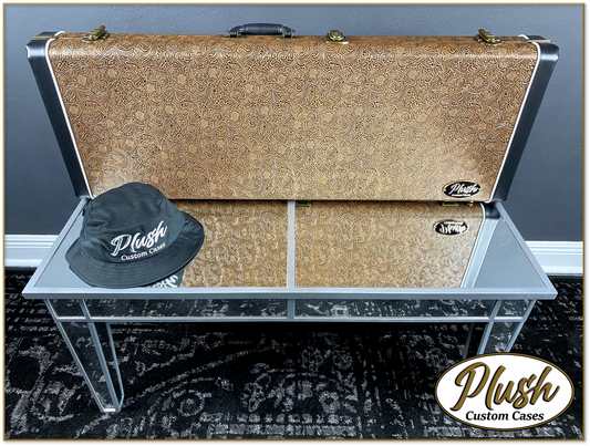 PlushCaster Tele®/Strat® Custom Guitar Case Tooled Leather Pattern 03 Black over Medium Brown with Bronze Fur